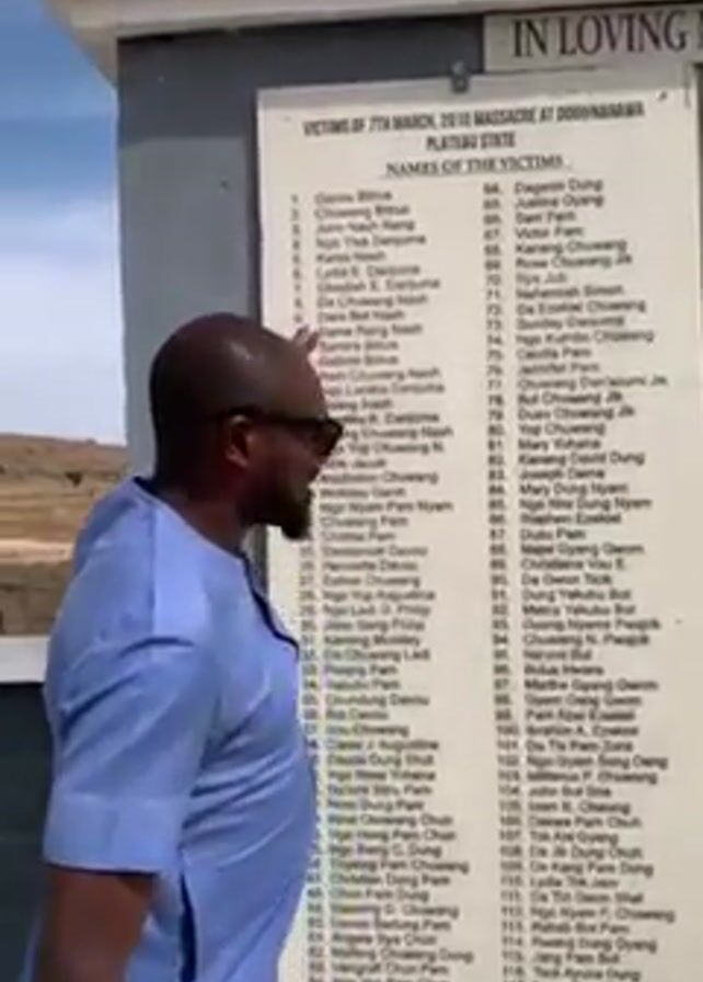 A man in a light blue shirt and sunglasses is standing next to a memorial listing the names of 226 victims of the March 7th, 2010 massacre at Dogo-Nahawa in Plateau State