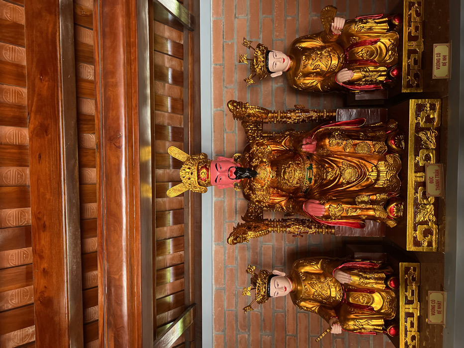 Three golden statues stand against a brick wall. The central, largest figure, with a pink face and ornate headpiece, holds a scepter-like object. Flanking it are two smaller figures, also adorned in golden attire and headwear. Each statue is positioned on a decorative wooden base with a small sign attached, likely indicating their names or roles. The statues face left, and on the left side is a decorative wooden wall with rows of engraved wood.