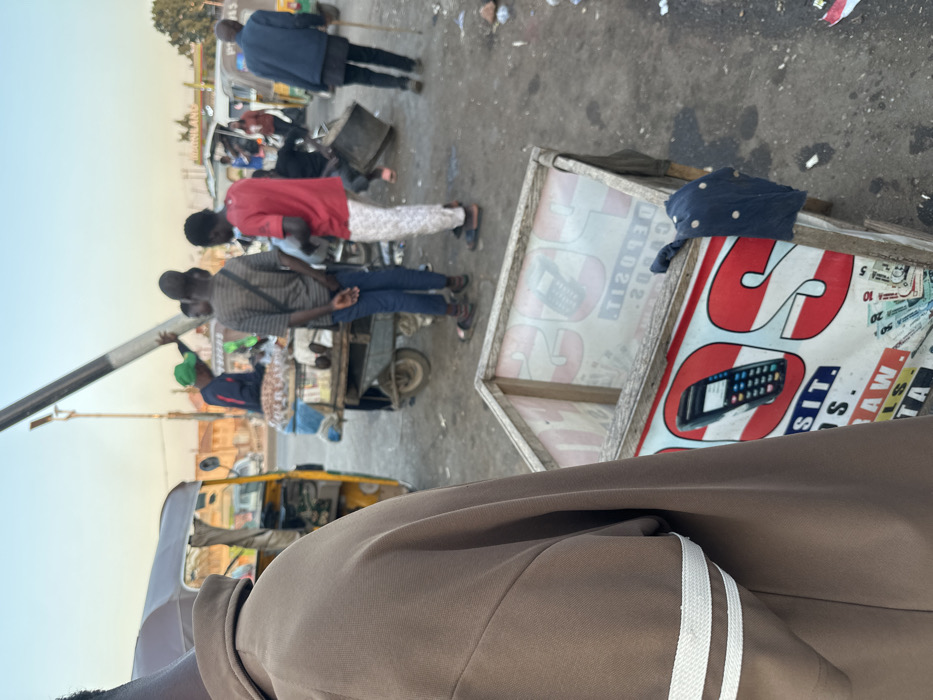 A bustling street scene includes pedestrians, a cart vendor, and a yellow auto rickshaw, all under a bright sky. In the foreground, a corner of a sign with a graphic of a mobile device and the letters 'SC' leans against the edge of a brown jacket adorned with white stripes. The setting evokes a vibrant and dynamic environment.