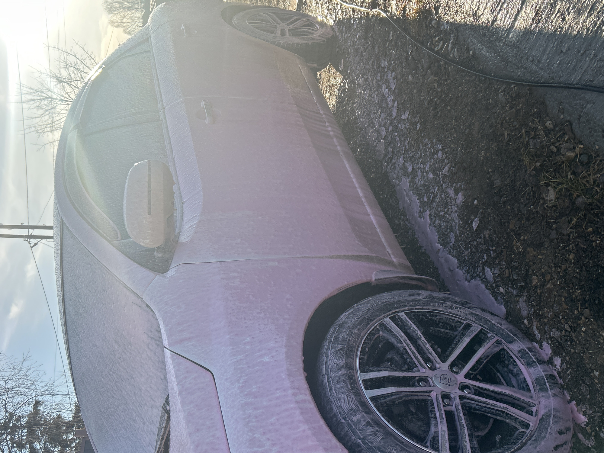 car covered in soap foam, likely during a car wash