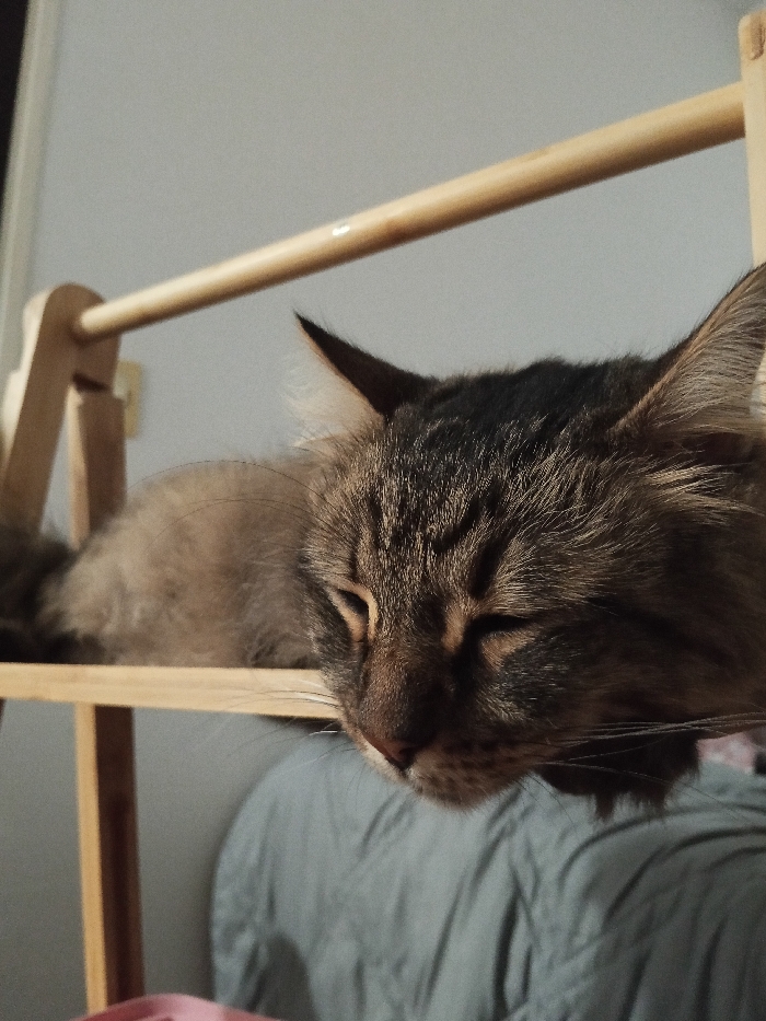 A fluffy brown tabby cat is asleep on a wooden shelf. The cat is lying on its side with its eyes closed and head resting near the edge of the shelf. The background is a plain wall, a bed with a grey blanket, and a pink object. The shelf is light-colored wood with a simple design. The cat's fur is long and striped with shades of brown and black.