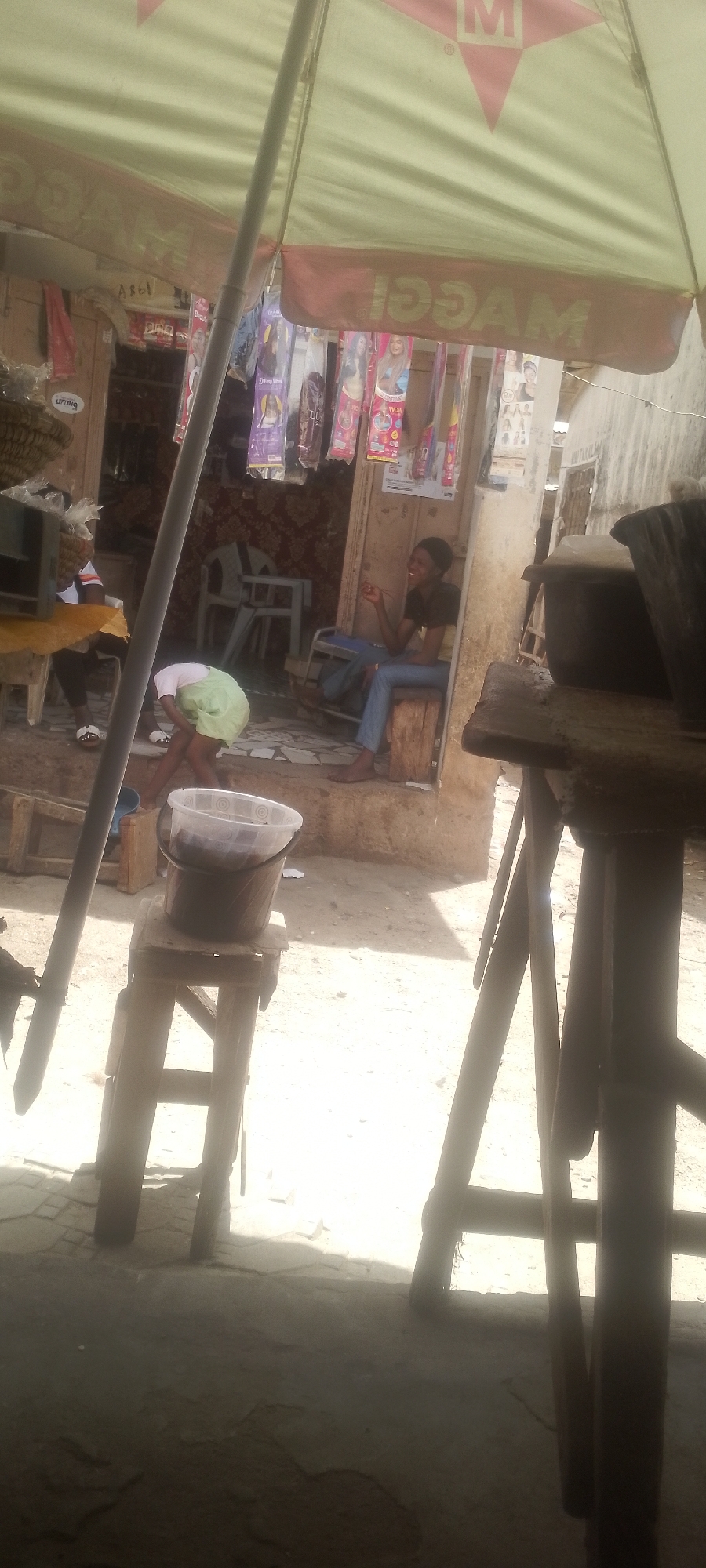 The image depicts a sunlit outdoor commercial or residential street scene consistent with an urban or semi-urban environment in Katsina, Nigeria, where Muhammadu Dikko Stadium is located. In the foreground, a large, light-colored market umbrella with a red trim and a reversed "MAGGI" logo is prominent, supported by a central pole extending diagonally from the lower left. Behind the umbrella, an open shop entrance is visible, displaying multiple packaged hair extensions or beauty products hanging from a rack. Three individuals are present: 1. A young individual, likely female, with dark skin, sits barefoot on a wooden stool just inside the shop entrance, wearing a dark t-shirt and blue jeans. They are smiling and hold a thin object in their right hand. 2. A second individual, wearing a white top and a light green skirt with white sandals, is bent over near the shop threshold, facing away from the camera. 3. A third person, partially visible on the far left, wears a white and orange striped top and white sandals, positioned behind a wooden table covered with a yellow cloth. The scene includes several wooden stools and tables. A clear plastic bucket with a patterned rim rests on a wooden stool in the mid-ground. On the far right, a dark, possibly metal, container sits on another wooden structure. The ground consists of brightly illuminated unpaved earth, transitioning to a patterned tiled step at the shop's entrance. Strong sunlight casts distinct shadows and highlights across the scene.