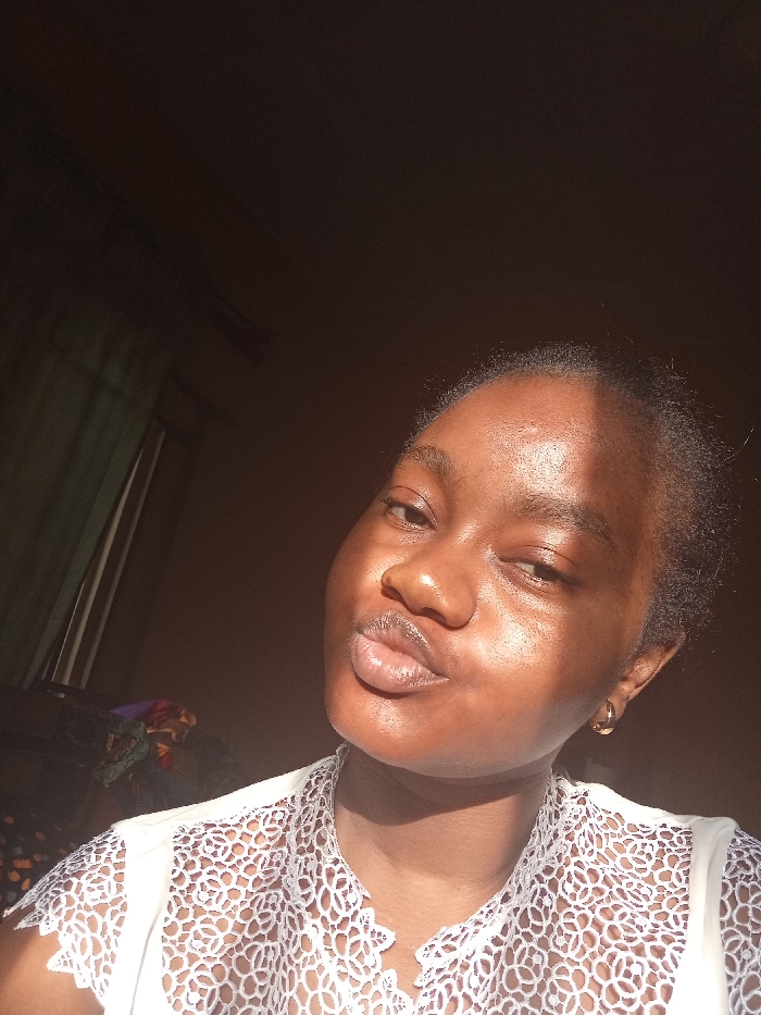 A young woman with dark skin poses for a selfie indoors. Sunlight illuminates her face, giving it a glossy sheen. She has full lips pursed in a kiss, and wears gold hoop earrings. Her top features a white, lacy floral design. The background is partially obscured by shadow, revealing curtains and what appear to be folded items or clothes.