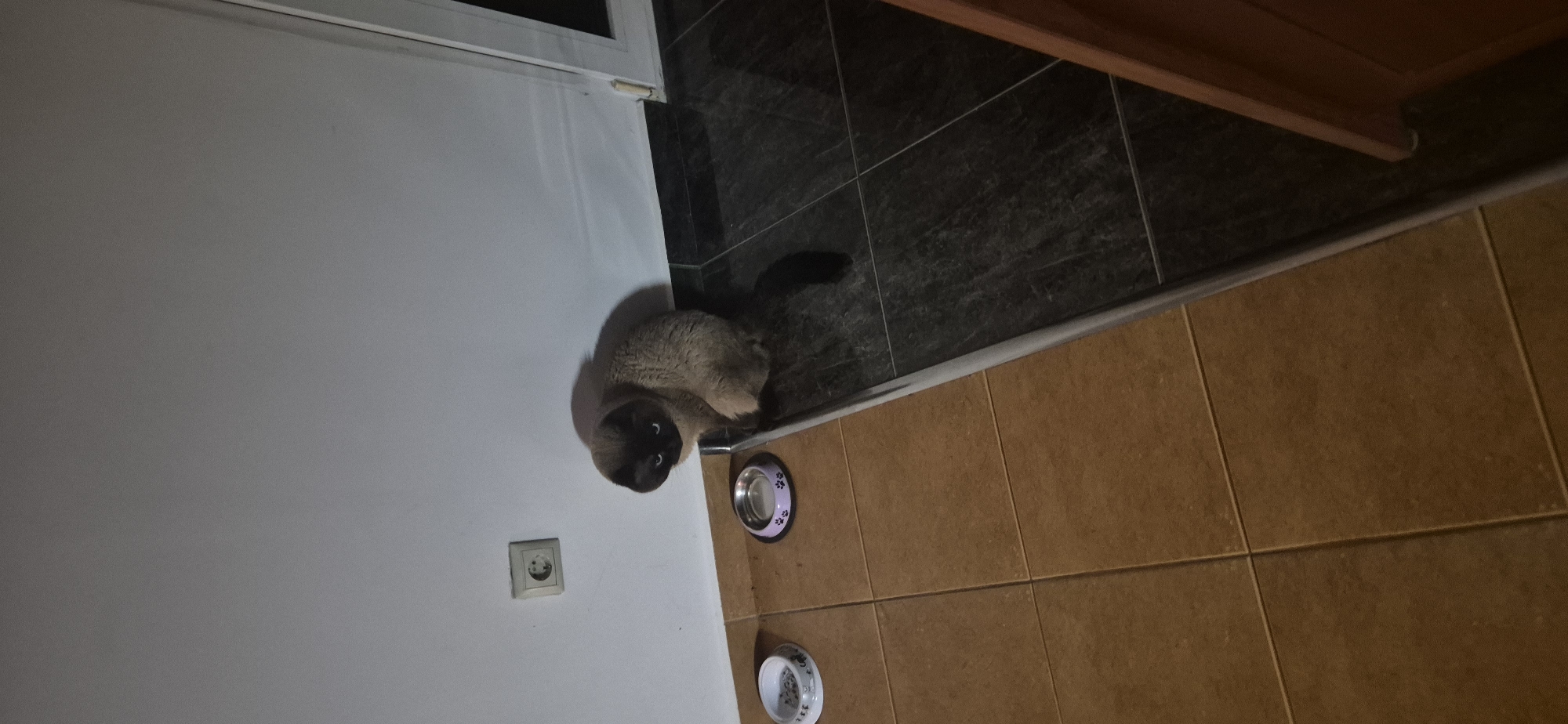 A photograph shows a Siamese cat next to a white refrigerator. The cat is positioned near two bowls on the floor and has a dark tail. The floor consists of brown and dark gray tiles. An electrical outlet is visible on the white wall. A piece of brown furniture appears in the top right corner. The location is unknown.