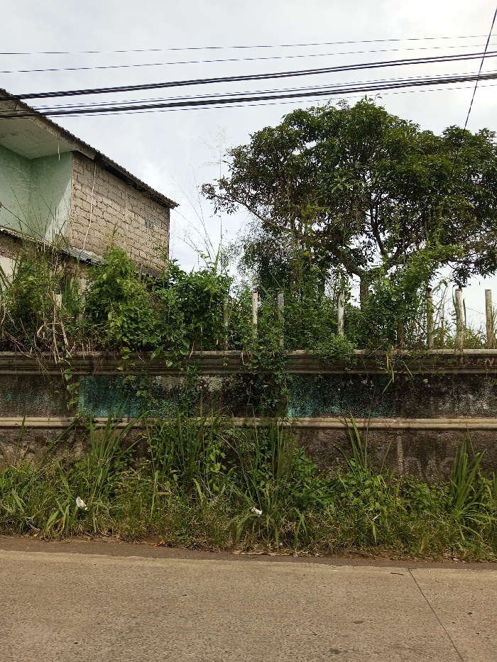 This image depicts an outdoor scene in the city of Kandenuwara, Sri Lanka, under an overcast sky. In the foreground, a segment of a grey asphalt road runs horizontally, with a faint linear marking visible. Immediately adjacent to the road, a strip of unkempt grass and weeds grows, interspersed with small white litter fragments. Behind the vegetation, a concrete boundary wall extends across the midground. This wall, approximately 1.5 to 2 meters high, features a horizontal molding near its top edge. Below this molding, a faded blue-green paint or residue is visible on the wall's surface. The wall is significantly overgrown with green vines and various plants. Extending upwards from behind the wall are multiple slender, vertical posts, likely part of a fence structure, partially obscured by the dense foliage. In the background, on the left, a portion of a two-story building is visible. The upper section displays exposed grey concrete blocks, suggesting an unrendered or unfinished facade, with a pale green underside to its roof eave. On the right, a large, mature tree with dense green foliage stands prominently, its branches extending against the light grey, overcast sky. Below and around the tree, additional dense vegetation is present. Overhead, multiple black utility wires stretch horizontally across the upper part of the frame. No individuals or active interactions are present in the scene.