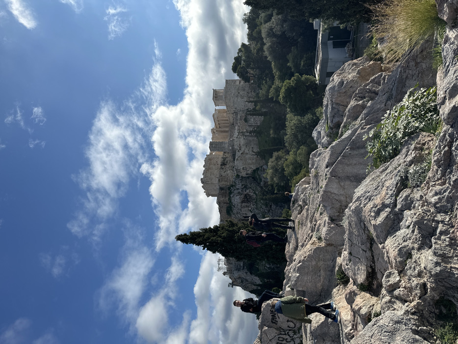 The image depicts a daytime scene on Areopagus Hill, looking towards the Acropolis of Athens, Greece. In the foreground, a prominent rocky outcrop dominates the lower half of the frame, showing weathered grey rock formations with sparse green vegetation. Graffiti is visible on a large rock in the mid-left foreground. Five individuals are present on the rocky terrain. On the far left, a person wearing a dark jacket and jeans is seated on a rock, facing right. Below and slightly to the right of them, a person in a green jacket and dark pants is walking down rocky steps, facing away from the camera and towards the center. To the right of these individuals, two more people stand on the rocks; one in a dark jacket with a backpack is facing towards the Acropolis, while the other, also in a dark jacket, is holding what appears to be a camera or phone to their eye, aiming it towards the Acropolis. Further back and to the right, a fifth person is partially visible behind a rock. In the mid-ground, a dense cluster of dark green trees and bushes partially obscures the lower slopes of the Acropolis hill. A tall, slender cypress-like tree stands prominently to the left of the Acropolis structures. On the right, a small, modern, light-colored building with a dark roof is visible amidst the foliage. The background is dominated by the ancient structures of the Acropolis, situated on a fortified hill. Visible buildings include the Parthenon on the right and other temples and fortifications to its left. Some scaffolding is apparent around parts of the ancient structures, indicating ongoing preservation work. The sky above is bright blue with scattered white cumulus clouds. The lighting suggests a sunny day, with shadows indicating the sun is positioned to the left or behind the viewer.