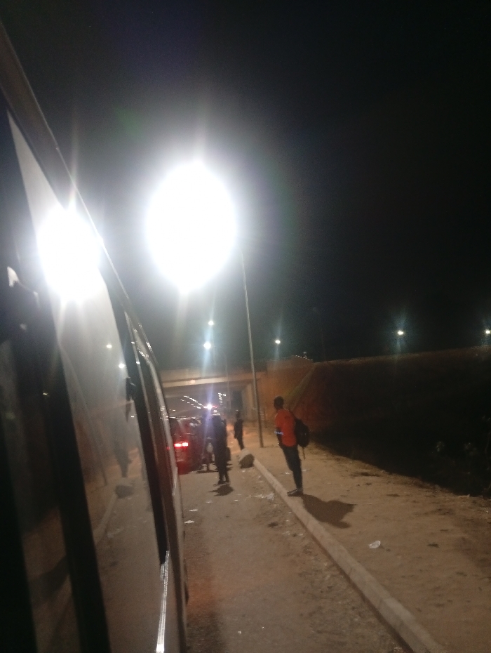 The image captures a nighttime scene on a roadway under an overpass in Unknown, Unknown. The perspective is from inside a vehicle, with its dark, reflective side panel occupying the left foreground. Two extremely bright, circular streetlights with significant lens flare illuminate the scene from the left and central upper portions of the frame. The paved road proceeds under a concrete overpass. Underneath the overpass, a dark vehicle is visible, displaying illuminated red taillights or brake lights. Three individuals are present: one individual, clad in an orange long-sleeved shirt, dark pants, and a dark backpack, stands facing right on the unpaved shoulder adjacent to a concrete curb on the right side of the road. Their distinct shadow is cast to their left. Two other individuals, dressed in dark clothing, stand on the paved road closer to the vehicle under the overpass. The right side of the frame features a dark, unlit earthen embankment rising from the unpaved shoulder. The sky above is dark.