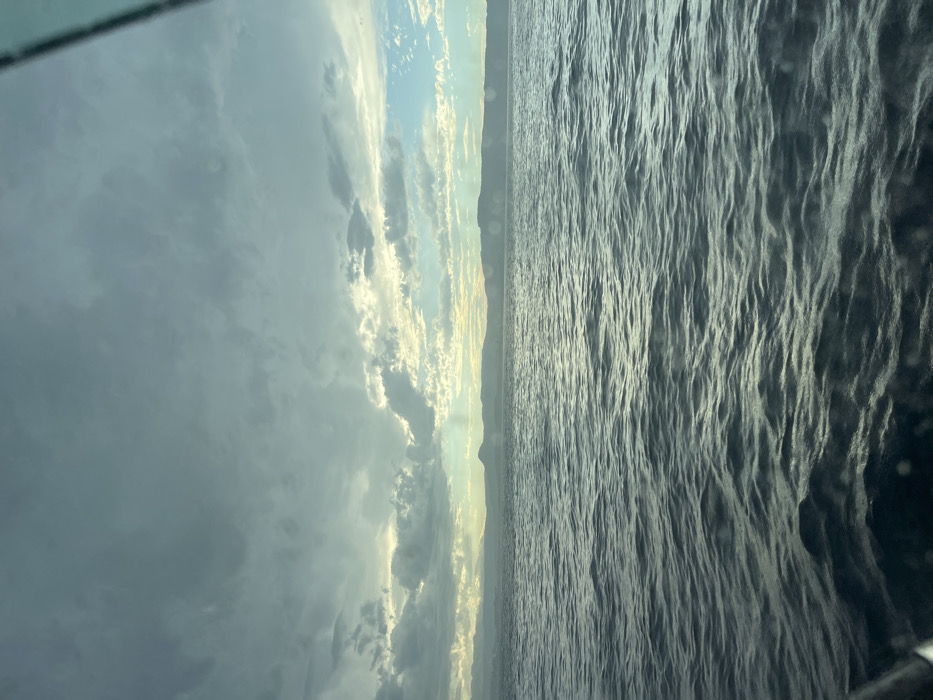 n ocean view with a horizon line running horizontally across the center. Dark, rippled water occupies the right half. On the left, there is a blend of dark and light clouds, with a section of light, partly obscured sky near the horizon. A landmass appears as a thin, darker band along the horizon, separating the sky from the water. The overall scene conveys a sense of movement and a potentially stormy atmosphere.