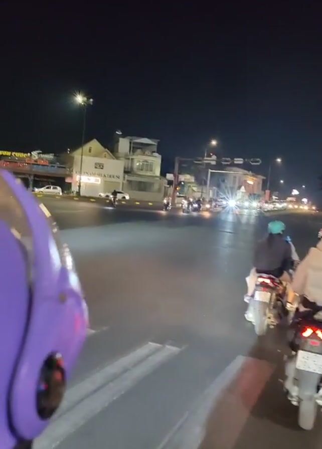 group of people riding motorbikes at night in a city. The camera is attached to one of the motorbikes, providing a first-person perspective. Streetlights illuminate the road, and there are buildings and billboards visible in the background. The motorbikes are moving along a multi-lane road, navigating through traffic at an intersection. The people on the motorbikes are wearing casual clothing, including hoodies and jackets. Some wear helmets. The overall scene suggests an urban environment at night, with people commuting or traveling on motorbikes.