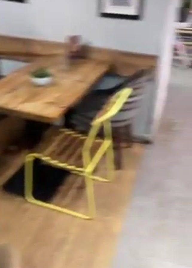 interior of a restaurant. There are wooden tables and various types of chairs and booths. A person wearing dark clothing is wiping down a table. A Christmas tree is partially visible in one shot. The floor is tiled. Some tables have small plants or other decorative items. The restaurant appears empty of customers in the video.