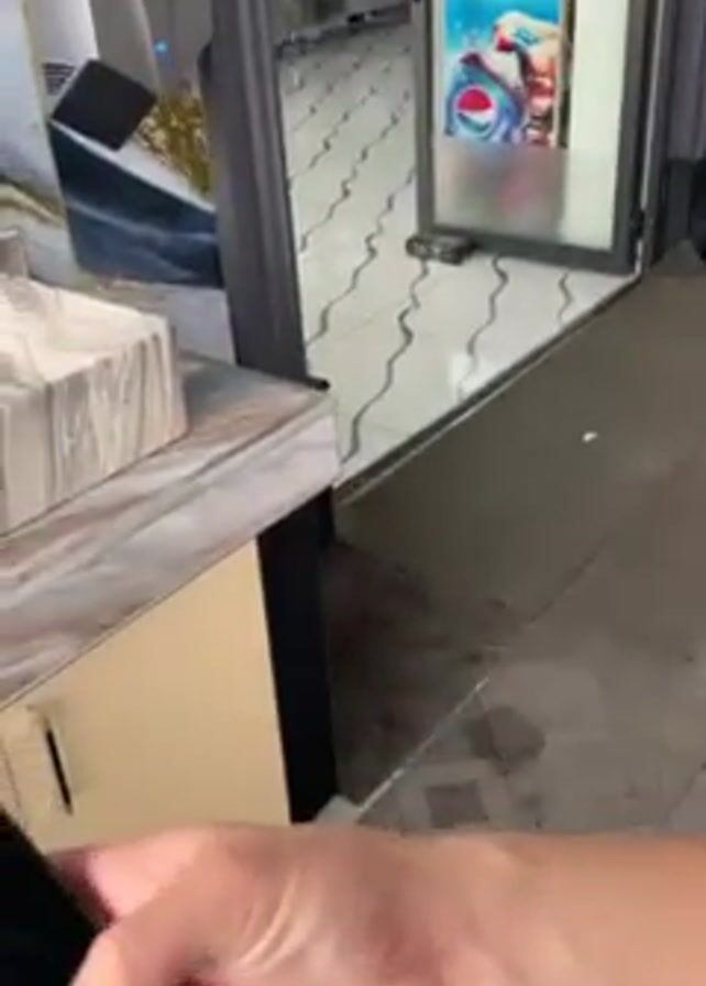 A person is holding a black smartphone. They interact with the screen using their finger. The phone is pointed towards a countertop area with a stack of white, folded items, possibly napkins or paper products. There's a cardboard box also visible near the stack. The setting appears to be indoors, potentially a food service establishment. The person is wearing a white long-sleeved shirt and a dark vest. The person is facing the camera at the beginning of the video, but shifts their focus downwards to the smartphone. A Pepsi advertisement is visible behind them. The floor is dark.
