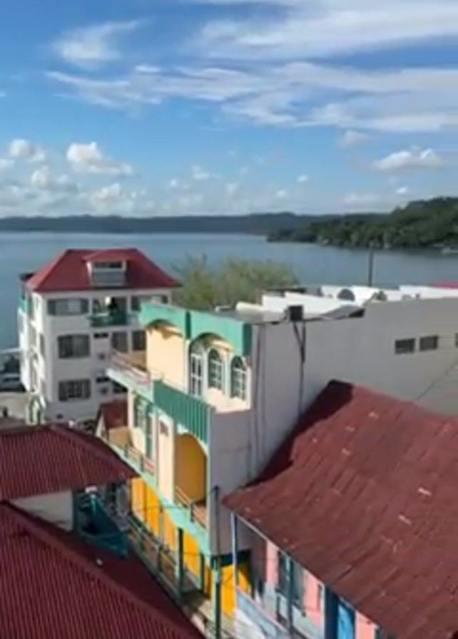 view of a town with a body of water in the background under a sky with scattered clouds. The foreground is filled with colorful buildings with red roofs. The buildings are a mix of sizes and architectural styles. Some have white walls and red roofs, while others are painted in yellow and turquoise. Clothes can be seen hanging out to dry on the roofs of some buildings. The water in the background is calm, with forested land visible on the opposite shore.