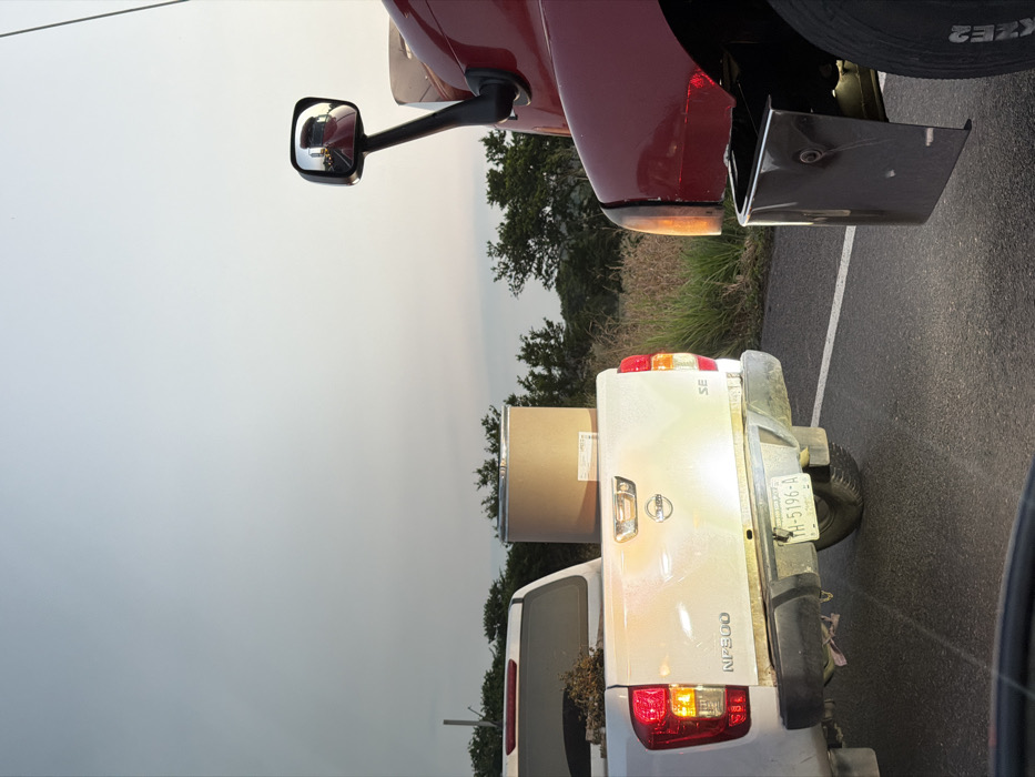 A white Nissan truck carries a large cardboard cylinder in its bed, partially obscured by a bright glare. The truck has a license plate and is equipped with a bumper. A red semi-truck with a side mirror is positioned beside it. The background includes sparse trees and what appears to be a hazy sky. The scene is set on a paved road.