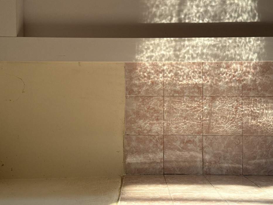 A section of a wall transitions from a plain beige paint to pinkish-tan square tiles. Sunlight dappled with a rippling texture falls across the tiles and upper wall, and casts shadows. Above the wall, a flat shelf or ledge is visible. The floor is covered with matching square tiles, also affected by sunlight.