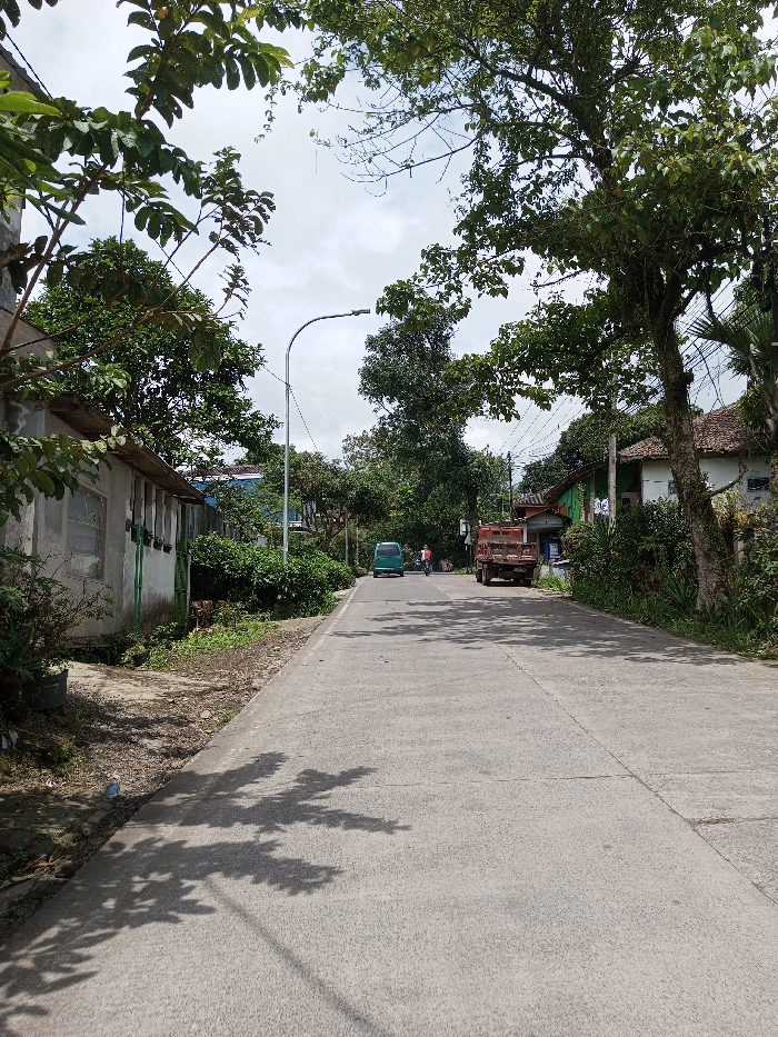 The scene depicts a paved road in Ariyalai, Sri Lanka, extending into the distance under a partly cloudy sky. Tree shadows are cast across the concrete road surface. On the immediate left, a weathered, light-colored, single-story building with visible green trim is partially presented in the foreground, adjacent to dense green foliage. A street light with a curved arm stands mid-distance on the left side of the road. On the right, a large tree with dark bark and green foliage occupies the foreground. Further along the right side, a red and brown flatbed truck with a wooden cargo bed is parked on the shoulder, oriented away from the viewer. Beyond the truck, multiple residential structures with varied roofing are situated amidst heavy green vegetation. In the mid-ground of the road, a teal three-wheeled vehicle proceeds away from the viewer, followed by an individual in red attire. Utility lines are visible traversing the upper portion of the scene between trees and structures.