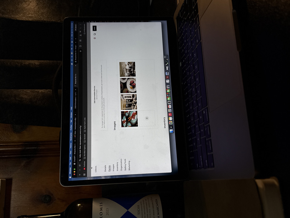 A laptop displays the Squarespace website configuration page for "Edit Intermediate Service" of "Bespoke Bev Co." The "Images" section shows four images and an option to add more. Tabs like "Details," "Forms," "Inventory," "Organization," "Selling Tools," and "Marketing" are visible. The Chrome browser's address bar shows "ruby-oval-2ber.squarespace.com/config/." Other open tabs include "2006 Winemakers" and "ChatOPT-Bespoke Bev C." A bottle of "PROMIS" wine, vintage 2023, is partially visible at the bottom.