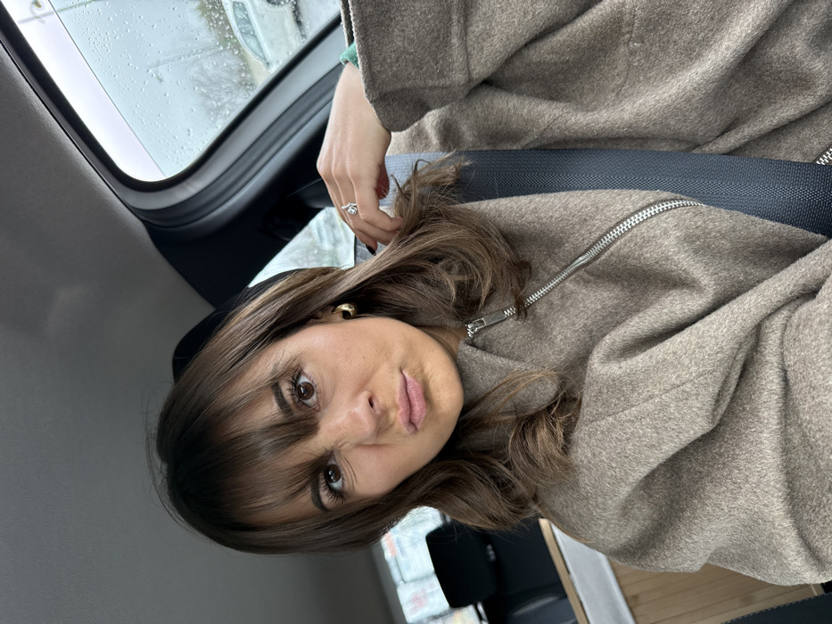 An adult female is seated in the passenger compartment of a vehicle, secured by a dark-colored seatbelt across her chest. She possesses medium brown hair with bangs, styled with waves, and is looking directly at the camera with a playful grimace, characterized by pursed lips and a crinkled nose. Her left ear displays a gold-colored hoop earring, and her left hand, partially visible, exhibits a ring with a clear stone on the ring finger, along with dark nail polish. A green or teal band is partially visible on her left wrist. She is wearing a textured, light brown or taupe collared jacket with a visible metal zipper. Through the vehicle's window, the external environment indicates a grey, overcast, and rainy day, with water droplets on the glass. Distant, blurry bare trees, a white vehicle, and a utility pole are visible in the background, suggesting an outdoor parking area or street. The specific location within Veauche, France, cannot be determined from the visual evidence provided.