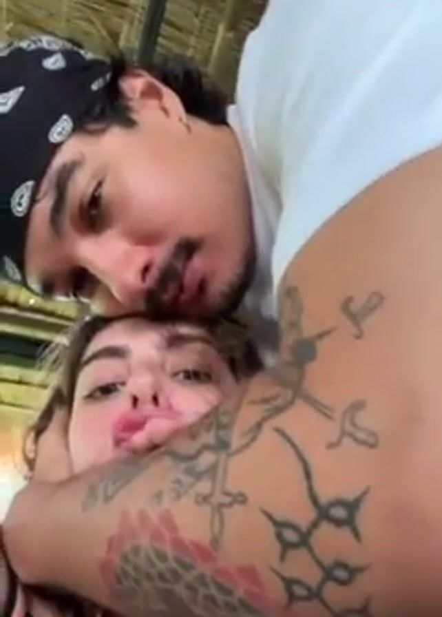 two people posing for a selfie. The man is standing behind the woman and has his arms wrapped around her, with his hands near her mouth. He is wearing a white t-shirt and a black bandana with white patterns. He also has visible tattoos on his arms. The woman is looking at the camera. The background appears to be a roof made of thatched material. The man leans forward and kisses the woman on the head. The video then ends.