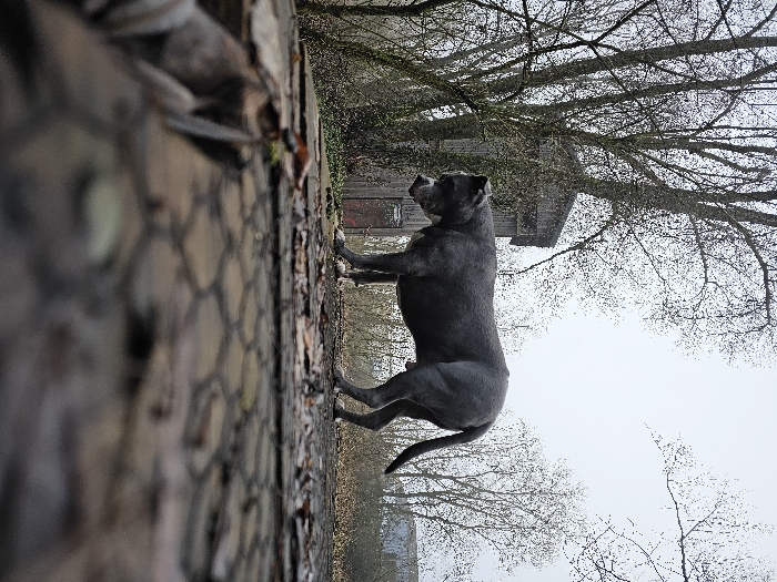 A large, muscular, grey-blue dog, consistent with a Pitbull-type breed, is positioned centrally, facing left, on a weathered, textured surface. Its head is lowered, and white markings are present on its muzzle and chest. The scene is photographed from a low angle, rendering the immediate foreground, composed of a similar textured surface with scattered fallen leaves, out of focus. In the midground, the dog stands on a surface displaying irregular, hexagonal-like patterns. The background features numerous bare deciduous trees against an overcast grey sky. A dilapidated wooden structure with vertical siding is visible behind the dog and to the left, partially obscured by trees. Distant, indistinct structures are discernible on the right horizon. This outdoor environment, characterized by dormant vegetation, is situated in Schifflange, Luxembourg.