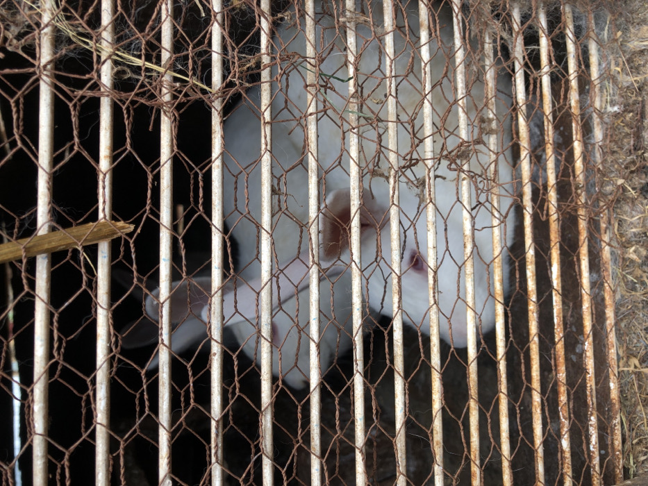 The image displays two white rabbits confined within a rusted metal cage in Nyeri, Kenya