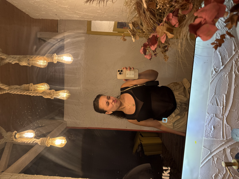 An interior scene in Ravadinovo, Bulgaria, depicts a female subject captured in a mirror selfie. The woman, with dark hair and wearing a black sheer tank top over a black bra, tan shorts, a gold necklace, and a black shoulder bag, holds a light-colored smartphone in her right hand, taking the photograph. Her facial expression shows puckered lips. Above her, multiple Edison-style light bulbs hang by thick ropes from a wooden ceiling beam. The mirror surface displays smudges. To the right, a large arrangement of dried plants and flowers, including reddish and light-colored elements, is visible. Below the mirror is a textured white counter with a gold dispenser. The mirror's reflection in the upper left shows a dark background with yellow objects and a partially visible sign that reads "ink!". The walls are light-colored and textured.