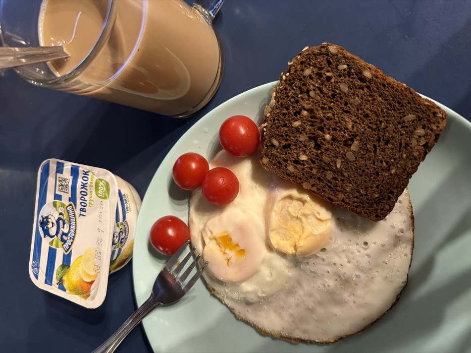 An overhead view depicts a breakfast scene on a dark blue tabletop. The primary subject is a light blue plate holding two fried eggs, four red cherry tomatoes, and a slice of dark whole-grain bread with visible seeds. A silver-colored fork rests on the left side of the plate. Adjacent to the plate, two white plastic containers of "ПРОСТОКВАШИНО" (Prostokvashino) brand pear-banana flavored "ТВОРОЖОК" (tvorog/quark) are stacked, with the top container displaying an expiry or production date of "02.04.26 10:29" and a QR code. To the right, a clear glass mug contains a light brown beverage, likely coffee with milk or cocoa, with a silver-colored spoon submerged within it. The scene is an indoor, domestic setting, located in Moscow, Russia, as evidenced by the prominent Russian dairy brand "Prostokvashino" packaging. No individuals are visible. The lighting casts defined shadows, suggesting a light source from the upper left.