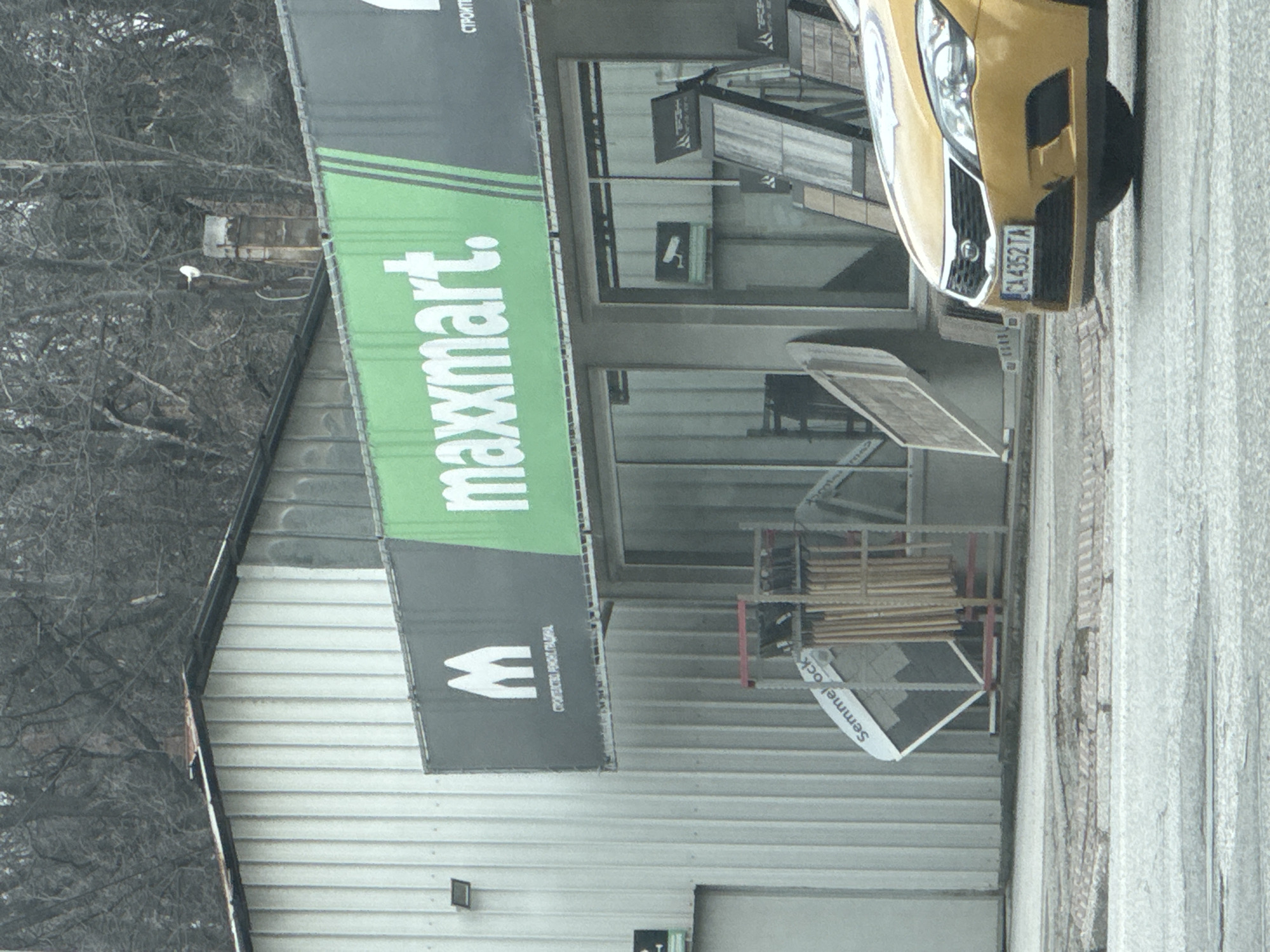 exterior of a "maxmart" store located in Sofia, Bulgaria. The store's sign features the word "maxmart." in green letters. A yellow car is parked in front of the store, with the license plate "CA4352TA" visible. Merchandise, including "Semmelrock" branded products, is displayed outside the store. The building's facade is clad in corrugated metal. Trees with bare branches are visible in the background.