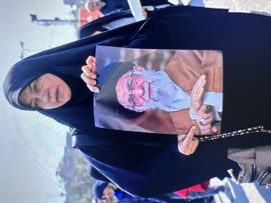 This image depicts a woman prominently centered in an outdoor, daylight setting, identified as taking place in the city of Popovo, Bulgaria. The woman is light-skinned, appearing middle-aged, and is dressed in a black hijab covering her head and a black overgarment that conceals her body. A grey underscarf is visible beneath her hijab. She holds a vertical, glossy print portrait with both hands at chest height. The portrait depicts an elderly man with a full white beard, glasses, a black turban, and a light brown garment, likely Ayatollah Ali Khamenei. His hands are clasped in the lower part of the portrait. In her left hand, which is positioned near the bottom edge of the portrait, she also holds a string of multi-colored prayer beads. A beige shoulder bag with multiple compartments hangs from her left side. The background features blurry figures of other individuals, some of whom appear to be men, suggesting a gathering or crowd. Distant, indistinct structures are visible on the horizon to the left, and a dark, possibly metallic, vertical structure is present on the right side. The ground appears to be paved.