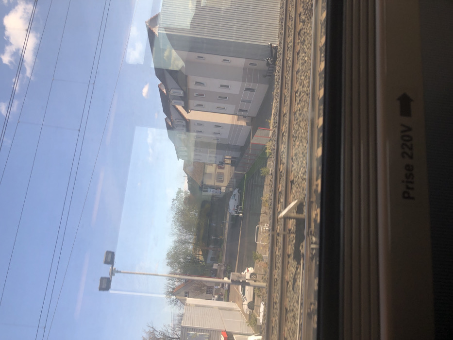 The image captures an exterior view from inside a train, presenting an urban landscape in Vendenheim, France