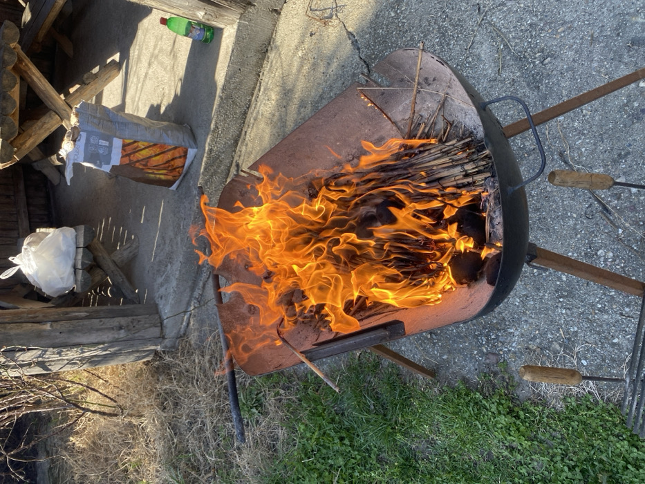 An elevated outdoor shot captures a metal grill containing an active fire, located on a concrete surface within the Palilula Urban Municipality, Serbia