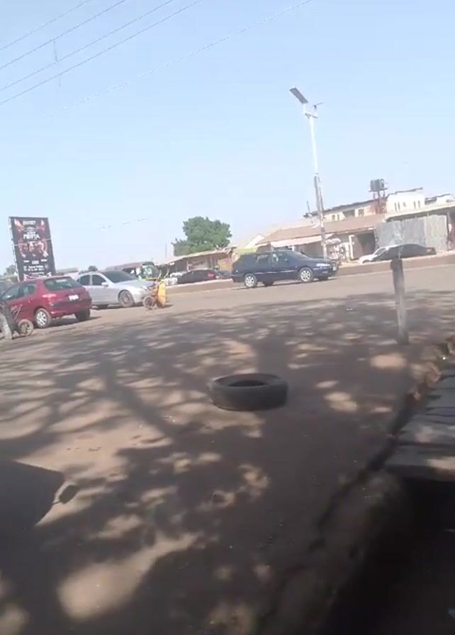 street scene on a sunny day. Cars and auto rickshaws are parked alongside the road. A man in a gray shirt and jeans walks over to an auto rickshaw, gets in, and sits in the driver's seat.
