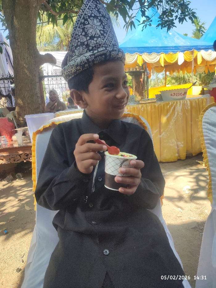 A young boy, dressed in a black long-sleeved shirt and traditional headwear, sits on a white chair. He holds a small cup filled with a dessert and a red spoon. He is smiling and looking to the right. In the background are trees, a blue and yellow tent, and other chairs. A woman wearing a hijab is partially visible behind the boy. The date "05/02/2026 14:31" is printed on the bottom right corner of the image.