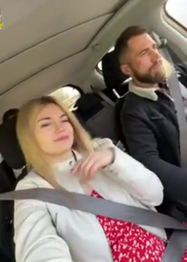 A low-angle, medium shot shows the interior of a moving car, where two people, a woman and a man, are riding in the front seats, each wearing a seatbelt. The woman is in the passenger seat, wearing a red floral dress and a light gray jacket. She has long blonde hair. She looks toward the camera and moves her right index finger. The man is driving, wearing a dark jacket with a white collar. He has a beard and looks forward as he drives. Trees are visible out the window. A box of snacks is visible in the back seat.