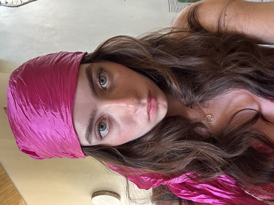 A young woman with hazel eyes and light skin poses for a selfie. She wears a bright pink headscarf and her brown hair cascades around her face. A small gold hoop earring is visible in her left nostril. A delicate gold necklace with a circular pendant adorns her neck. The background appears to be a brightly lit room, possibly a bedroom, with glimpses of furniture and a wall.