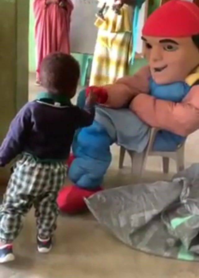 small child in a blue sweater and plaid pants standing in front of a large, seated figure resembling a cartoon character. The figure has a red cap, a light-skinned face, and is wearing a light brown jacket and blue pants. The child reaches out and touches the figure's hand. In the background, two women stand near a whiteboard with writing on it. One woman wears a pink hijab, and the other holds a small child. The scene appears to be inside a classroom or similar space. A large grey bag sits on the floor next to the seated figure.