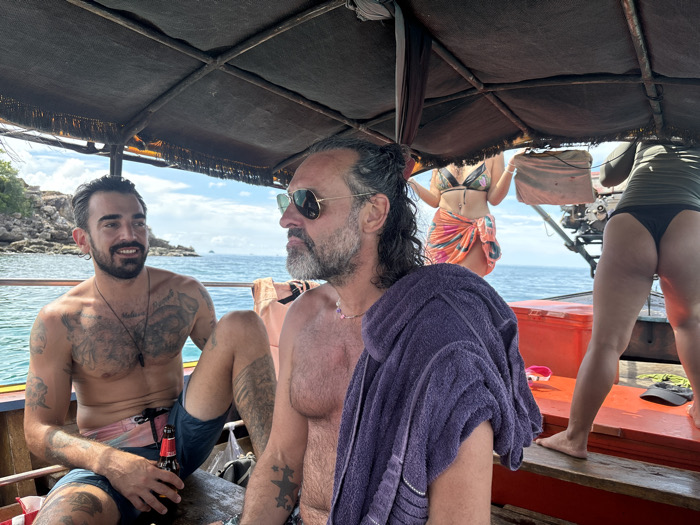 The image displays four individuals on a wooden long-tail boat in the coastal waters of Ban Ko Li Pe, Thailand. The boat features a dark fabric canopy supported by wooden poles and has orange painted accents. In the foreground, on the left, a shirtless male with dark hair, a beard, and extensive chest and arm tattoos is seated, smiling towards the right. He holds a red-labeled beer bottle in his right hand and wears patterned swim shorts and a dark necklace. Adjacent to him, in the center foreground, another shirtless male with dark hair tied back, a beard, and sunglasses is seated, looking towards the right. He has tattoos on his left arm and a purple towel draped over his left shoulder, along with a beaded necklace. In the mid-ground, a female stands behind the center male. She wears a patterned bikini top, a navel piercing, and a colorful sarong tied around her waist. Further back on the right, a person is visible from behind, wearing an olive-green top and black thong-style bikini bottoms, standing near the boat's long-tail engine. The surrounding environment consists of clear, turquoise water, with rocky, vegetated landmasses visible in the background under a bright sky with scattered white clouds. A red cooler is situated in the mid-ground of the boat.