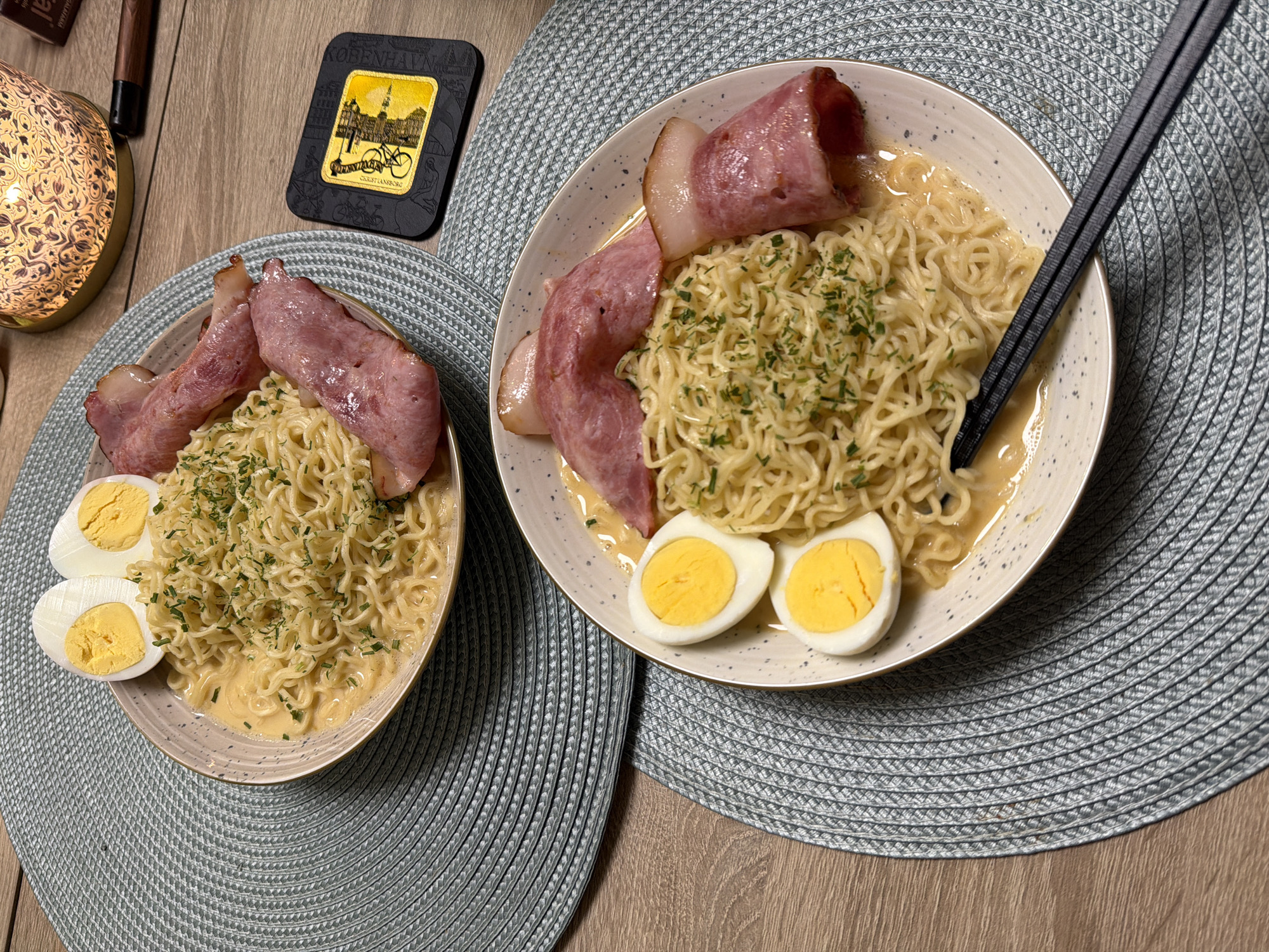 two plates of noodle soup with ham and boiled eggs, placed on woven placemats on a wooden surface. The bowls are light-colored with speckled edges. Each plate contains noodles in a creamy broth, topped with chopped herbs, slices of ham, and halves of hard-boiled eggs. One bowl has chopsticks resting on top. To the left of one plate, there is a decorative lantern and a dark object, possibly a cigar case. Above the other plate, a black coaster with a golden bicycle illustration is visible. The setting appears to be indoors, possibly a dining table. There is no information in the image that points to the location being in Bankya, Bulgaria.