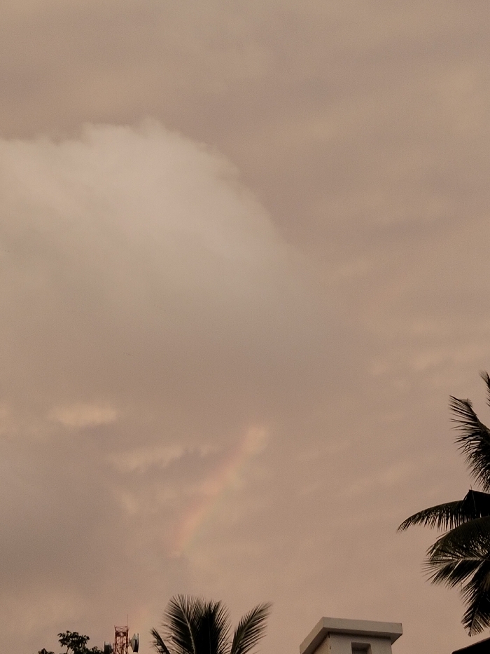 The image captures an overcast sky over Panton, Indonesia, characterized by muted brownish-pink and grey cloud cover. A faint, partial rainbow arc is discernible in the lower-left quadrant of the sky. The foreground shows the tops of green trees on the far left, partially obscuring a red and white communication tower structure. Prominent dark green palm fronds extend into the frame from the bottom-middle and right. On the bottom-right, the upper portion of a white, cubic building with a dark rectangular opening is visible. No individuals or specific actions are depicted.