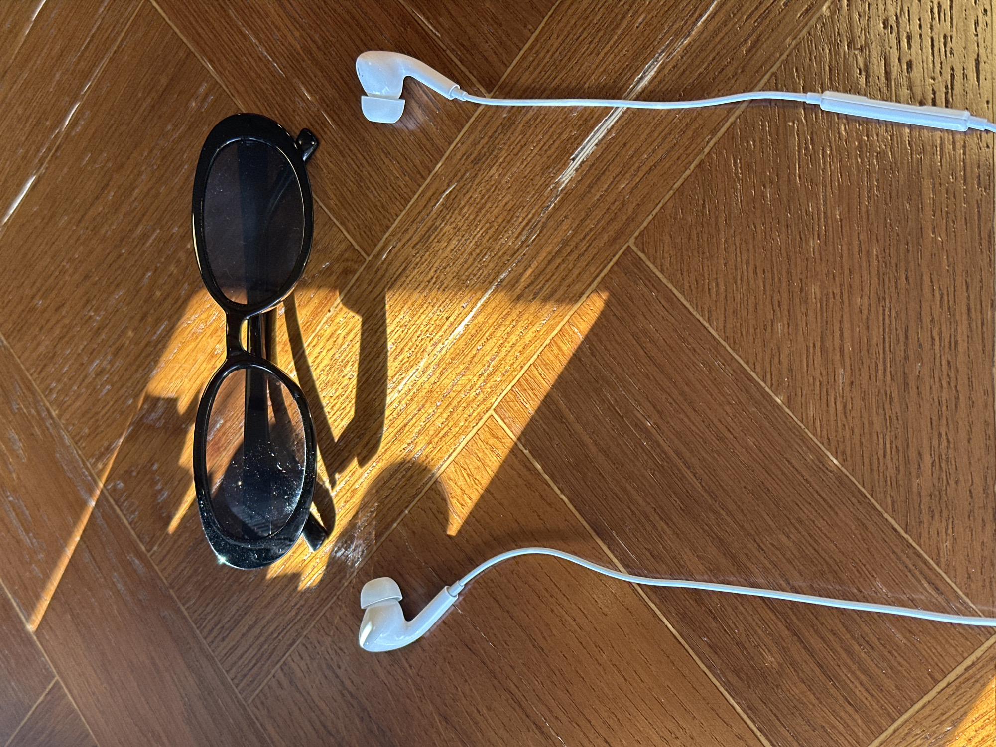 pair of black sunglasses and white wired earbuds on a brown wooden surface. The sunglasses are in the upper left corner, casting a distinct shadow due to strong lighting. The earbuds are positioned so that each bud is at opposite corners of the image, with their wires extending toward the center. The earbuds are not in use. There are no people present. The location of the image is not discernible within Surgut, Russia, or any other location.