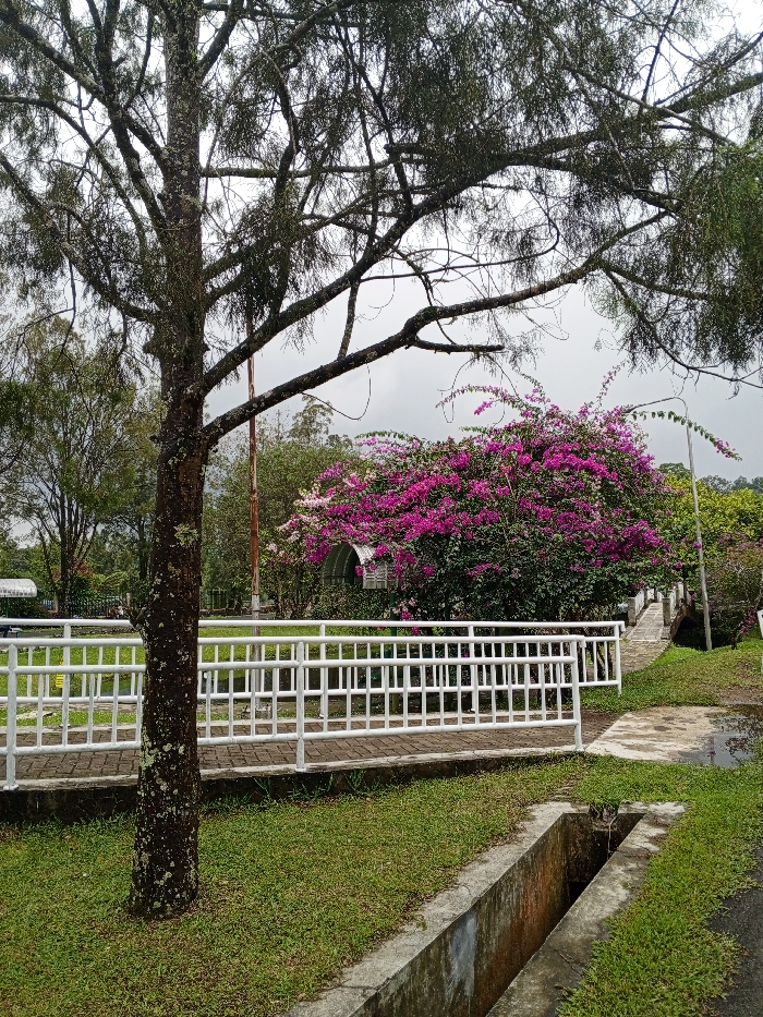 A tall, bare tree stands in the foreground, with a white fence behind it. Lush, pink bougainvillea bushes bloom beyond the fence, partially obscuring a white, arched structure. A concrete walkway extends past the fence, leading towards a bridge. Green grass covers the ground, and a concrete drainage ditch runs along the right edge of the frame. Overcast sky and other trees are in the background.
