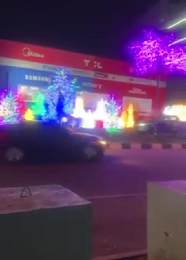 The video appears to be recorded at night in an urban area. There is a store visible in the background with brands such as Samsung, TCL, and Sony displayed. The store's facade is lit up. In front of the store, there are several decorative Christmas trees and figures illuminated with various colorful lights. A black car drives by. The camera is held by someone walking along a sidewalk separated from the road by square concrete blocks.