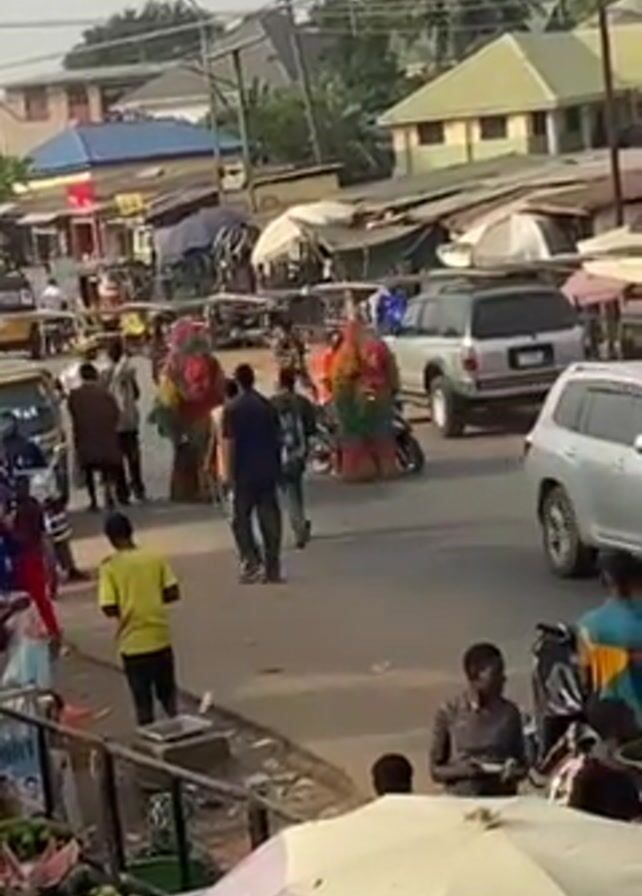 street scene in a town or village. There are several buildings with corrugated metal roofs visible, along with trees. The street is filled with people, vehicles like cars, motorcycles, and auto rickshaws (tuk-tuks). Some people are walking along the road, while others seem to be shopping at roadside stalls. The central point of focus is a group of people accompanying figures dressed in large, colorful costumes. These figures appear to be part of a procession or performance. The costumes seem to be made of fabric, with bright red, yellow, and green colors.