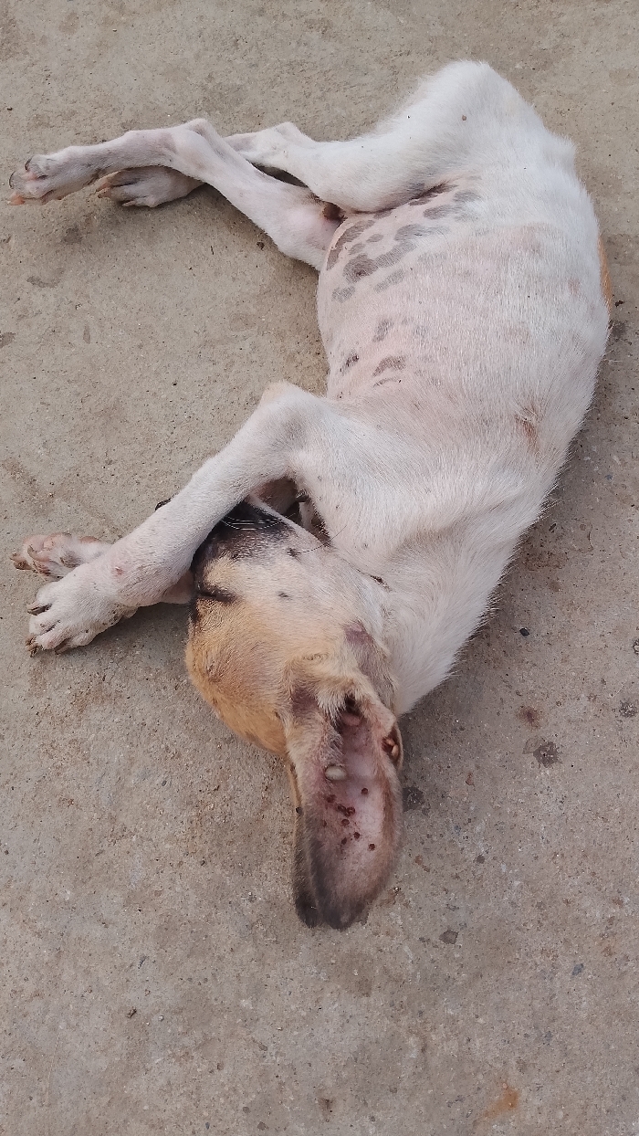 - "A recumbent, emaciated dog is observed lying on its left side on a light gray concrete surface in the city of Unknown, Unknown" by FM-ymGPj1, licensed under CC BY 4.0
