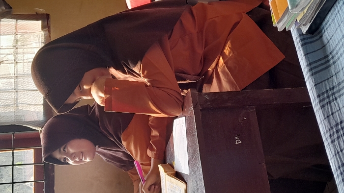 Two individuals wearing dark brown hijabs and similarly colored clothing sit at a dark wooden desk, engaged in writing or studying