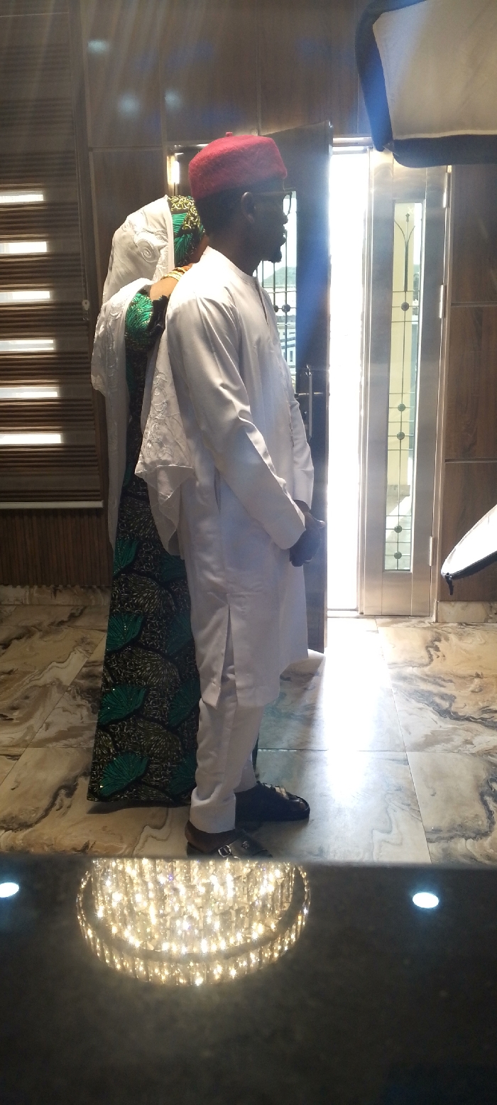 The image depicts an indoor scene in Lokoja, Nigeria, featuring two individuals positioned in a posed stance. In the foreground, a male figure stands in profile facing right, wearing a white long-sleeved tunic (kaftan) and matching trousers. He has a short beard, glasses, and a red felt cap. His hands are clasped in front of him, and he wears dark brown or black dress shoes. Behind him and slightly to his left, a female figure is partially visible. She wears a dark green garment with a teal fan-like pattern, covered by a white, possibly embroidered, shawl. Gold-colored bangles are visible on her right wrist, and her head is partially covered by a patterned fabric. The environment suggests a formal setting. The floor is covered with polished, light-colored marble or tiles featuring swirling grey and brown patterns. The left wall has horizontal wooden slat paneling. A brightly lit doorway with glass panels and metal framing is present in the background, creating a strong backlight. To the far right, a white photographic softbox is visible, indicating a professional or semi-professional photography setup. The bottom portion of the image shows a highly reflective, dark surface, reflecting a large, multi-tiered circular crystal chandelier emitting warm light. The individuals appear stationary, engaged in a formal photographic session or event.