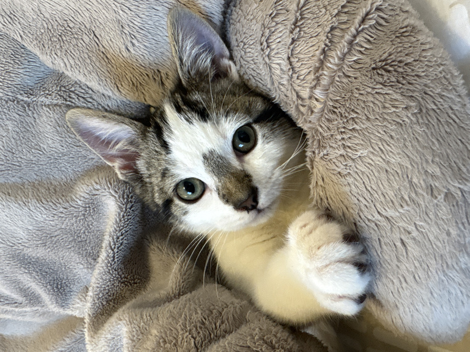 - "A domestic kitten is depicted resting on a plush, light gray or beige textured blanket or pet bed" by FM-w8akN2, licensed under CC BY 4.0
