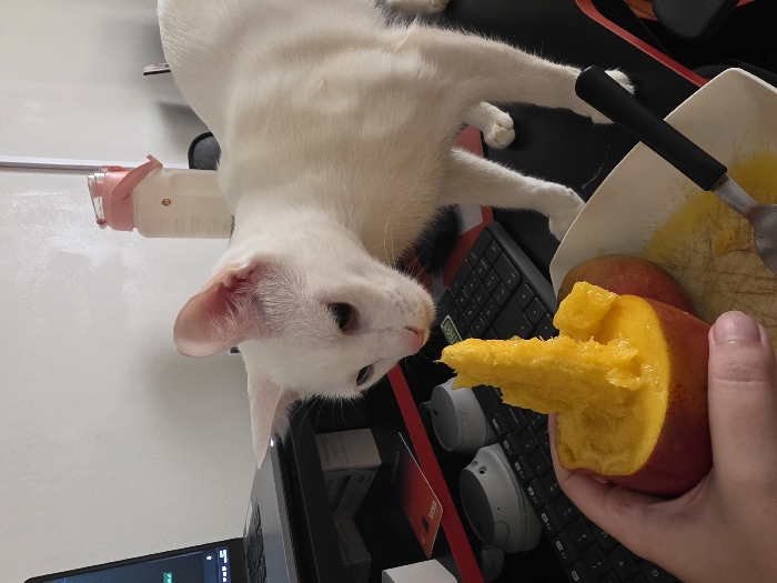 A close-up indoor photograph depicts a human hand, positioned in the lower-left, holding a partially consumed mango. The mango displays vibrant orange flesh and red-yellow skin, with some flesh appearing sculpted or torn. A white cat stands on a black desk surface, positioned to the right of the mango, with its head lowered and directed towards the fruit, appearing to observe it. Adjacent to the mango, a white rectangular dish contains mango residue and a silver spoon with a black handle. The background features an open black laptop with an active screen on a raised stand, a black keyboard, several small grey electronic devices, and a red card. A transparent water bottle with a pink lid is visible further back, resting against a plain white wall. No specific visual elements within the image identify the location as Buenos Aires, Argentina.