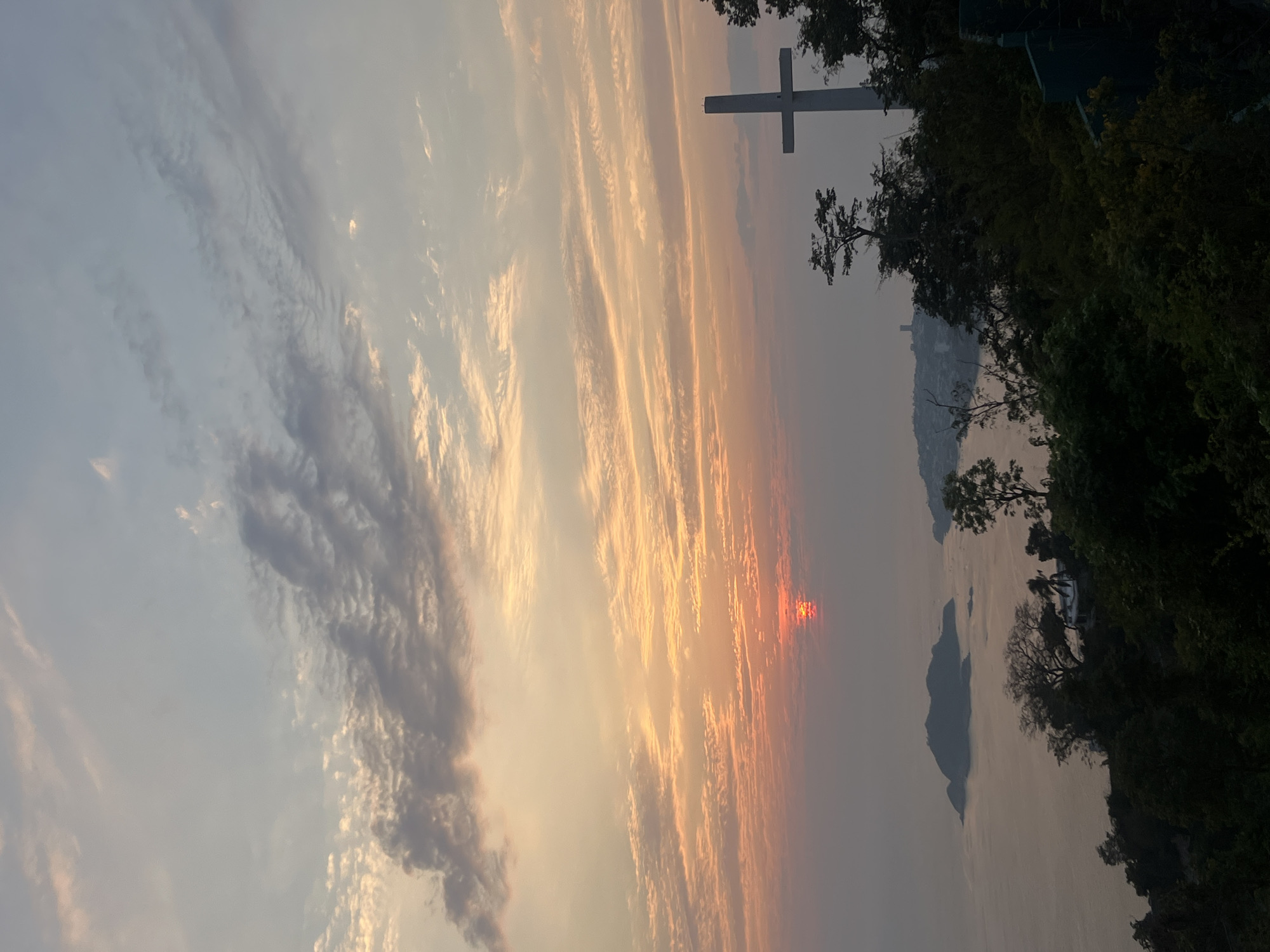 The image captures a view over Acapulco Bay, Mexico, at sunset. A large Christian cross is silhouetted against the sky in the mid-ground, positioned near the edge of what appears to be a forested hillside. The setting sun is visible through the atmospheric haze, reflecting off the water of the bay. The water surface is calm, with the outline of small islands visible in the distance. The sky is filled with long, striated clouds illuminated by the setting sun, transitioning from yellow-orange near the horizon to pale blue above. Vegetation is visible along the right side of the image.