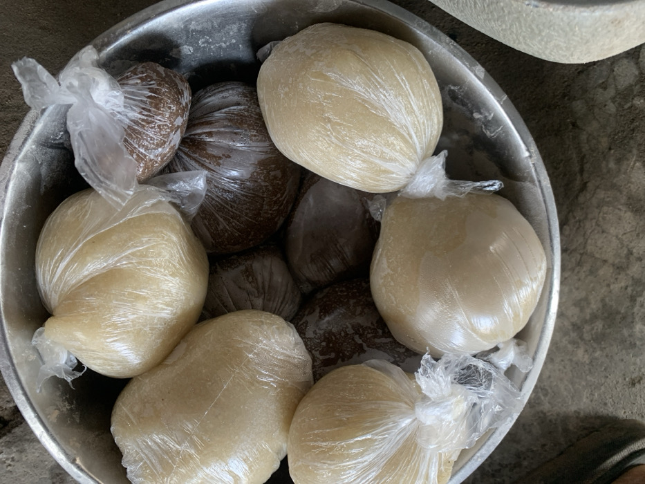 The image displays an overhead view of a circular, dull silver-colored metal basin, approximately 30-40 cm in diameter, filled with numerous individually plastic-wrapped items. The basin's interior surface shows minor scuffing and residue. Contained within are two distinct types of wrapped substances: approximately ten light beige to off-white, opaque, semi-solid masses, each roughly spherical or ovoid and measuring 8-12 cm in diameter, individually sealed in clear, thin plastic bags tied at the top; and approximately seven dark brown, granular or coarsely textured substances, also individually sealed in clear, tied plastic bags of similar size. These items rest on each other within the basin. The basin is positioned on a light gray, textured surface, possibly concrete. No individuals are present. The scene is located in the city of Unknown, Unknown.