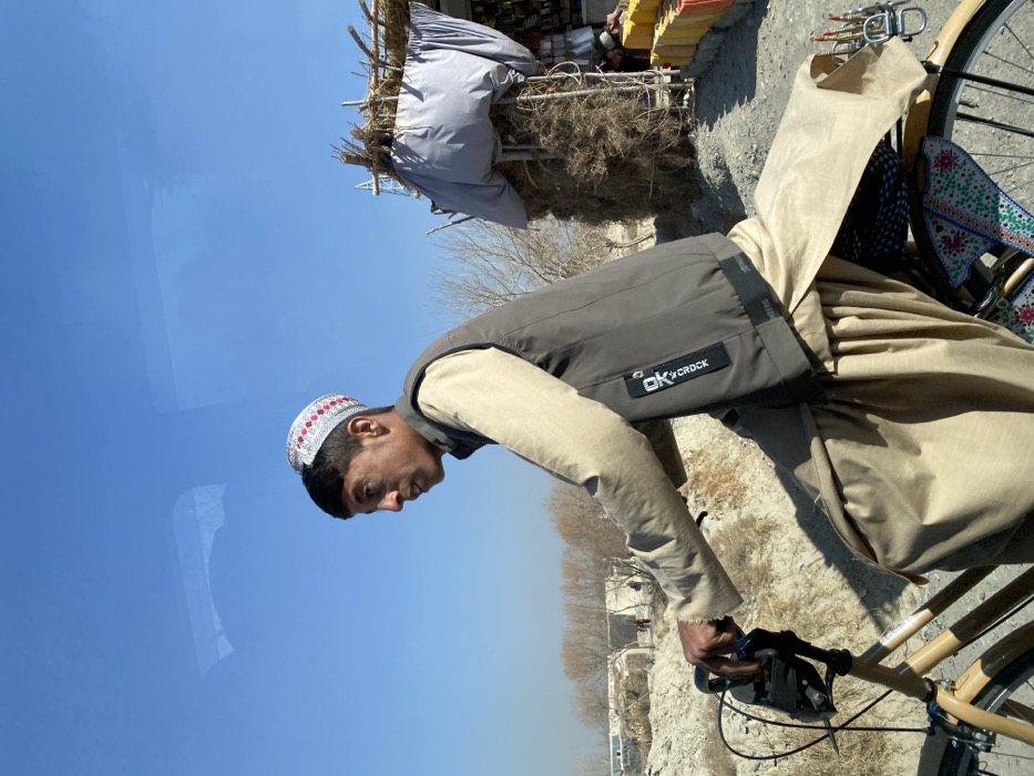 A man in traditional garb and a white embroidered cap rides a bicycle. He wears a gray vest with the text "ok CROCK" on it, and the bicycle is laden with goods. The sky is clear blue, and the background shows a dusty landscape with sparse vegetation and old buildings. The camera angle is slightly tilted.